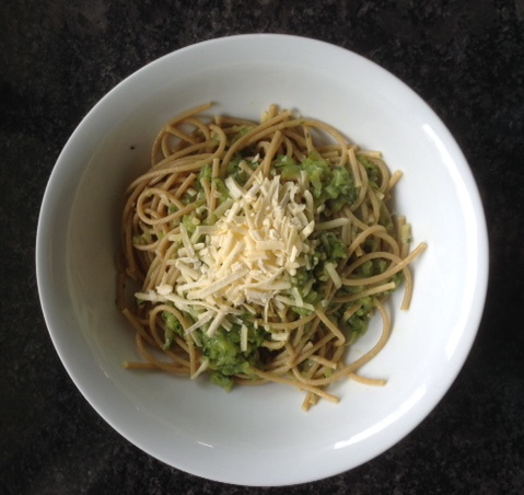 Once done, I mixed it through the pasta and served with grated cheese (recommend parmesan but like I said, the cupboards were bare so frozen, pre-grated cheddar had to do), salt and pepper to taste.