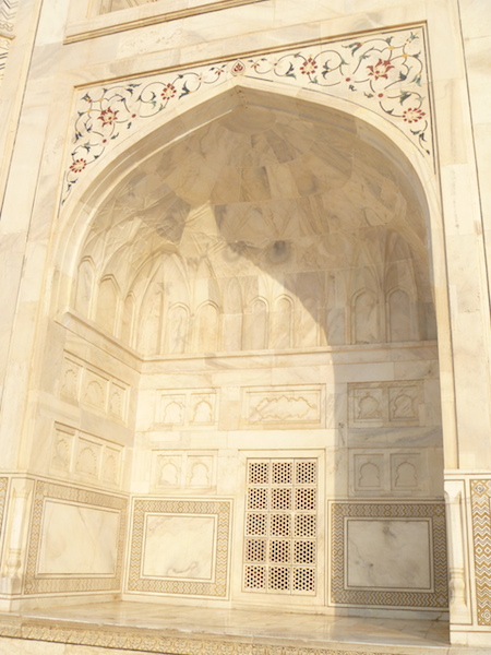 As for the Taj Mahal, typically the photos are from a disance showing the reflecting pool with the gleaming white domed building in the distance. What is surprising is that up close, the building is actually an array of creams and soft pastel shades. Its spectacularly beautiful with the stone carvings and stone inlays which you simply can’t see from a distance.