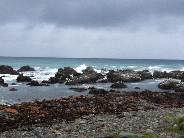We grabbed a takeaway lunch at a bakery and then went to the main beach at Kaikoura by the railway station for a quick walk with the dogs. It’s a shingle beach and as the weather was drizzly, fairly deserted. Alice and Celia had a blast! They just loved the freedom of being off their leads and it was nice to be able to walk them in such a beautiful environment. It turned from drizzle to rain as we walked so we headed back to the car and headed off to Blenheim.