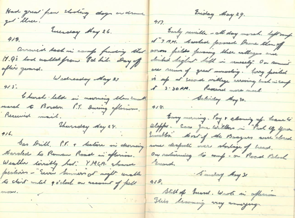 Gas drill. P.T & lecture on ???. Marched to Roman Road in afternoon. Weather terribly hot. YMCA showed pictures – “Seven Sinners” at night. Unable to start until 9 o’clock on account of full moon.