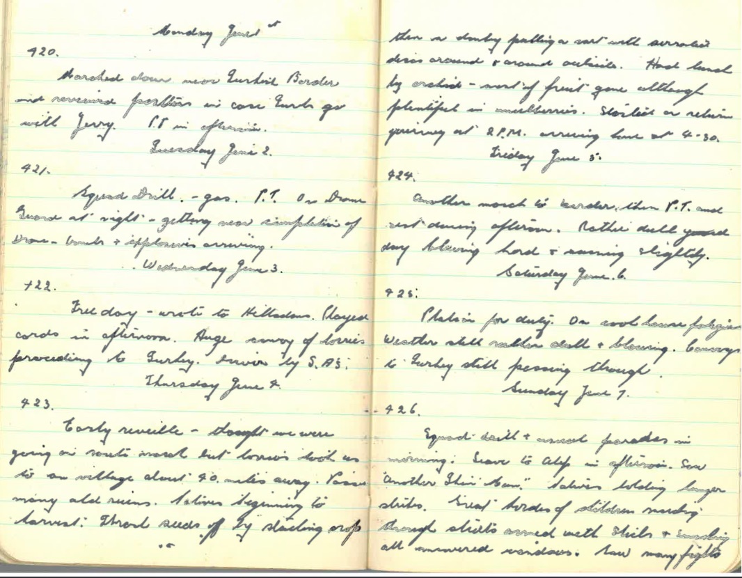1. Day 420 — “Marched down near Turkish border and received ??? in case Turks go with Jerry.” I believe this reads “Marched down near Turkish border and reviewed positions in case Turks go with Jerry. Day 426 — Next to last sentence: Great hoards of children ….