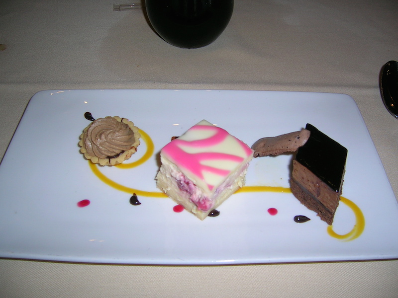 • A trio of Esterhazy Cake (Almond Meringue) Strawberry Cheesecake, and Chocolate Silk Mousse