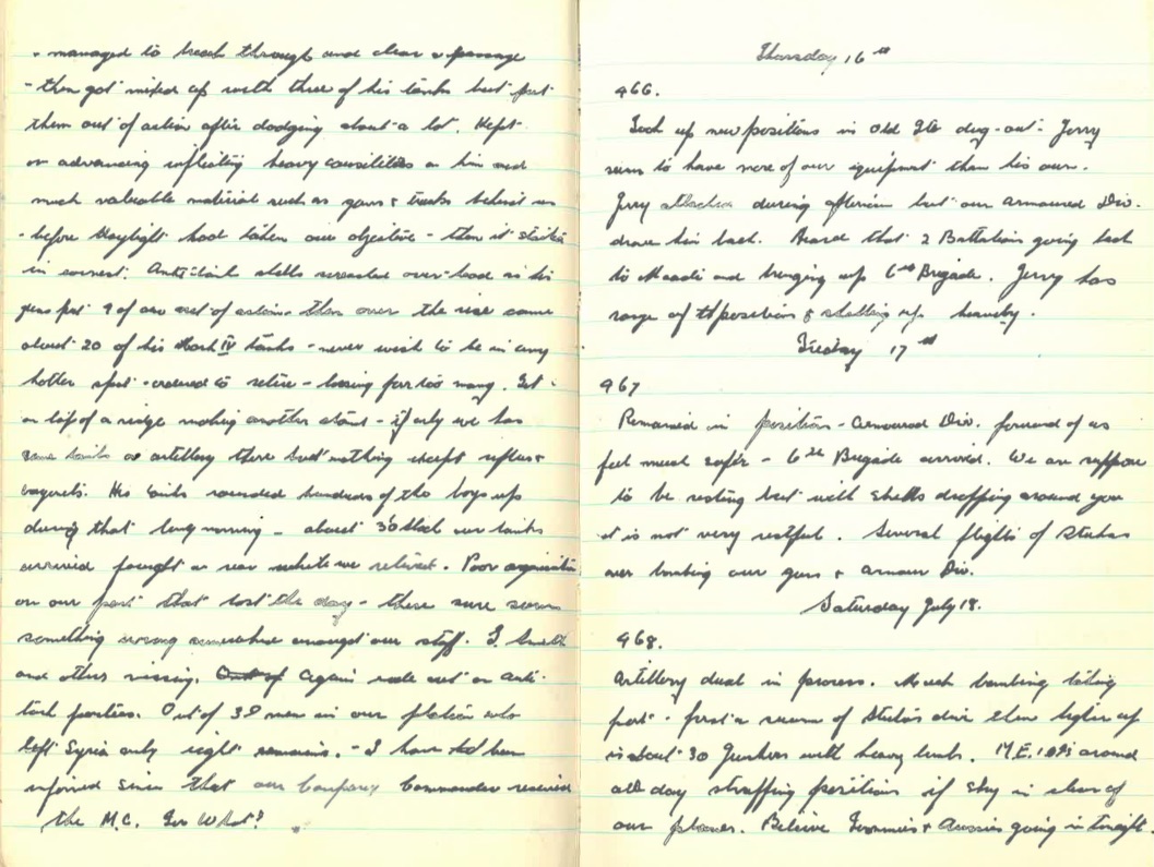 … managed to break through and clear a passage – then got mixed up with three of his tanks but put them out of action after dodging about a lot. Kept on advancing inflicting heavy casualties on him and much valuable material such as guns & tanks behind us – before daylight had taken our objective – then it started in earnest. Anti-tank shells crashed overhead as his guns put 4 of ours out of action then over the rise came about 20 of his Mach IV tanks – never wish to be in any hotter spot – ordered to return(?) – losing far too many. Got on top of ridge making another stand – if only we had some tanks or artillery there but nothing except rifles & bayonets. His tanks rounded hundreds of the boys up during that long morning – about 3 o’clock our tanks arrived fought as rear while we returned. Poor organisation on our part that lost the day – there sure seems something wrong somewhere amongst our staff. J Smith and others missing. Again rode out on anti-tank portee. Out of 39 men in our platoon who left Syria only eight remain. I have been informed since that our Company Commander received the M.C (Military Cross). For what?