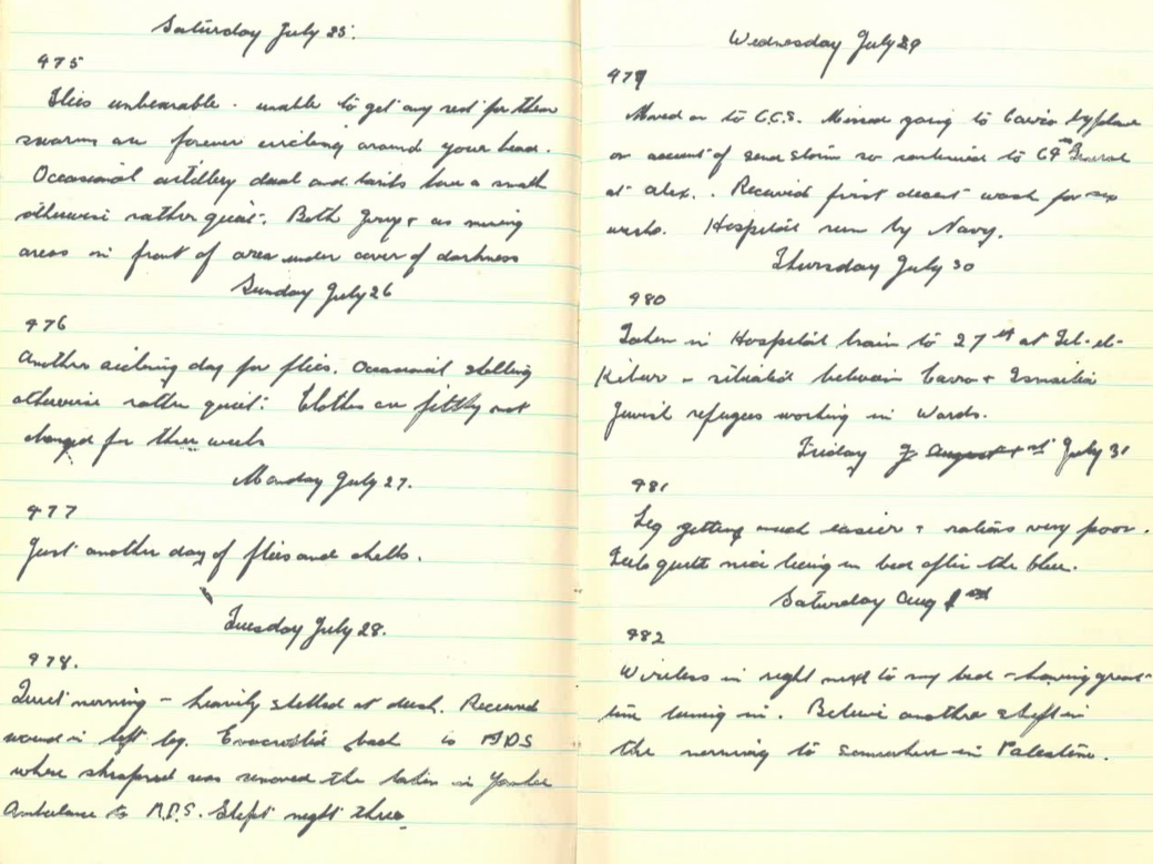 Quite morning – heavily shelled at dusk. Received wound in left leg. Evacuated back to ADS (Advanced Dressing Station) where shrapnel was removed. Then taken in Yankee ambulance to MDS (Main Dressing Station). Slept night through.
