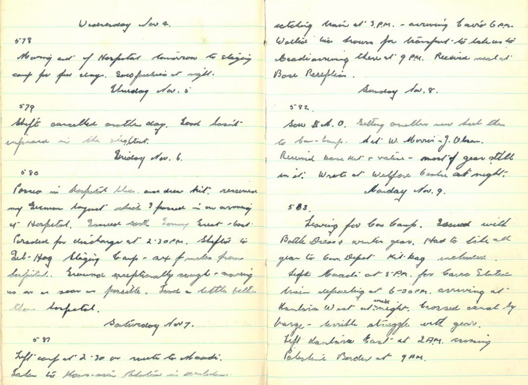 Passed in hospital blues and drew kit. Received my German bayonet which I passed in on arriving at hospital. Issued with Tommy great-coat. Paraded for discharge at 2.30PM. Shifted to ???-Hag(?) staging camp (a camp where everyone is collected together to go somewhere else) – six miles from hospital. Ground exceptionally rough – moving us on as soon as possible. Food a little better than hospital.