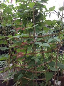 an update on the beans up a ‘tee-pee’ post of earlier. They are flourishing, and the ‘woven’ outer framework has made it easier to pick the beans, and no doubt easier for the bees to get at the flowers.