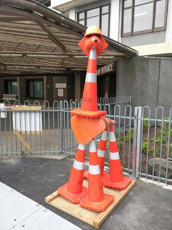 photo 5At some point, a dickhead (and I mean that in the nicest possible way), vandalised one of the giraffe out near Sumner.  This lead to it being removed for repair.  In typical Christchurch fashion, someone fashioned a replacement one out of road cones.