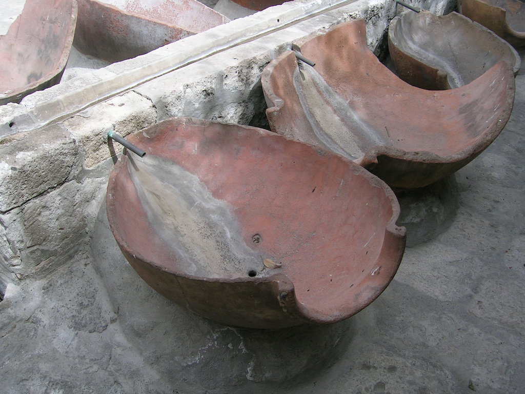 What is the function of the half-pot appearing basins shown in some of the photographs?