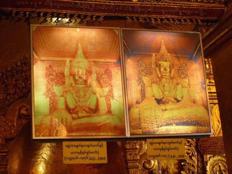 There are TV screens around the pagoda so you can see the gold leaf being applied. Also its men only so close to the Buddha as in most Myanmar pagodas.