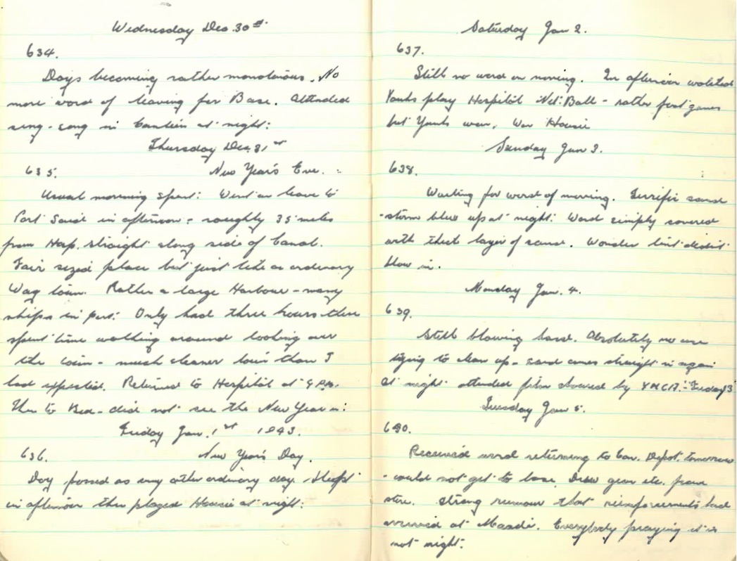 Usual morning spent. Went on leave to Port Said in afternoon – roughly 35 miles from Hosp. Straight along side of canal. Fair sized place but just like an ordinary wog town. Rather a large harbour – many ships in port. Only had three hours there. Spent time walking around looking over the town – much cleaner town that I had expected. Returned to hospital at 9PM. Then to bed – did not see the New Year in.