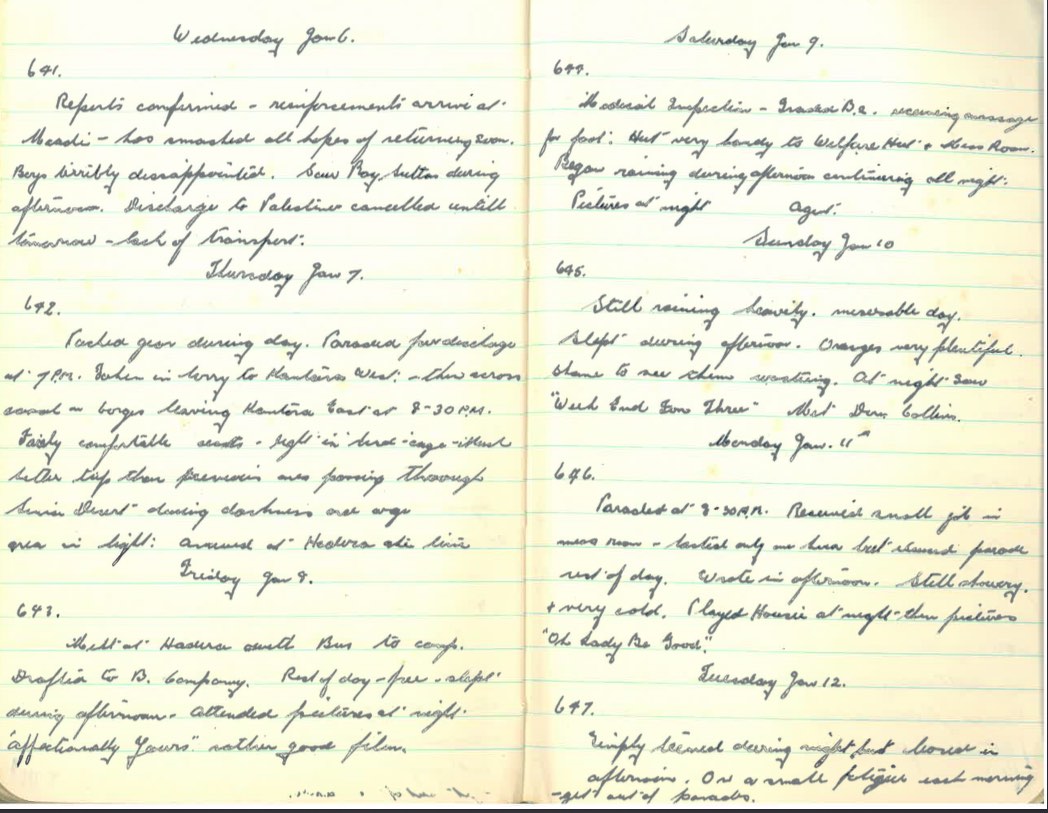 Met at Hadera with bus to camp. Drafted to B Company. Rest of day free – slept during afternoon. Attended pictures at night. “Affectionately Yours” rather good film.