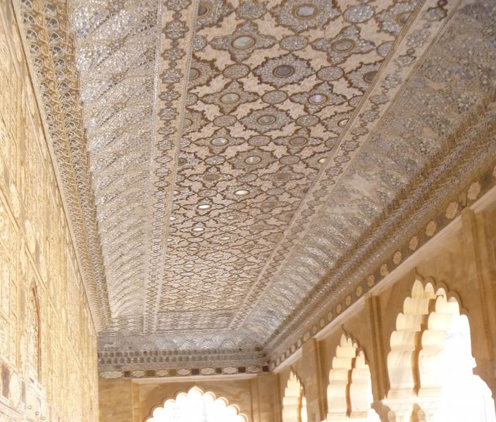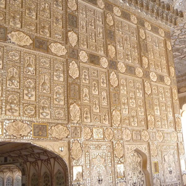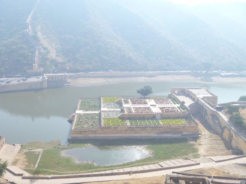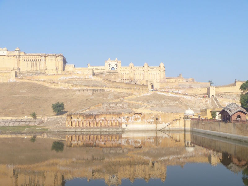A short distance from Jaipur in Rajasthan, India is the Amber or Amer Fort. This imposing fortress on the hill overlooking the lake is spectacular. From the outside, at first glance it appears to blend into the landscape but as you enter into the inner parts of the fort the colours and decorations are subtle and beautiful. The fort was built in 1592 AD by Raja Man Singh I.