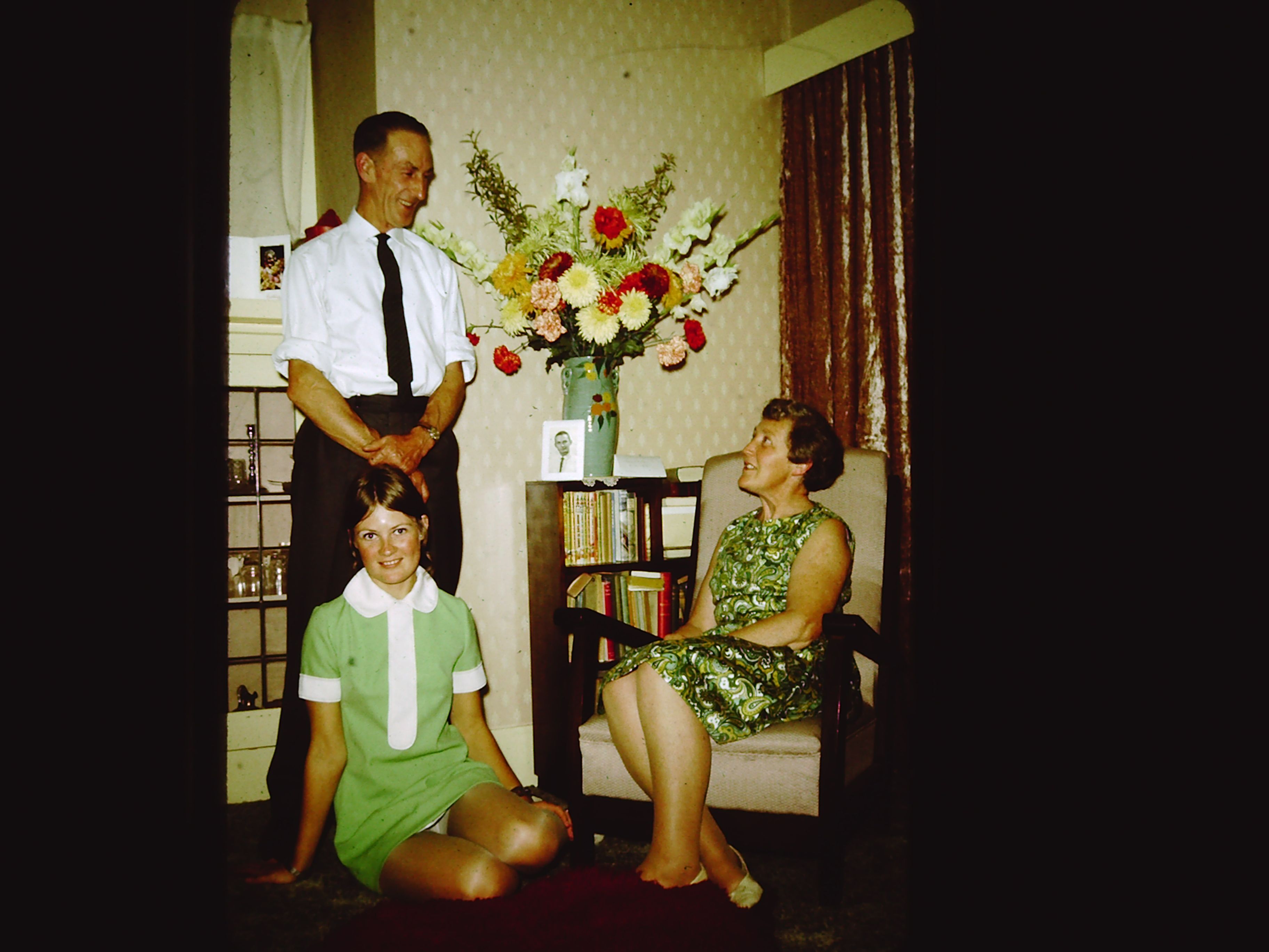 On the bookcase behind my Gran is a photo in a frame – my Dad. I’m guessing he had probably left New Zealand to go on his 6 month visit to the UK … which lasted 9 years. Next to the photo is the most spectacularly hideous vase hidden under a mass of what were most likely plastic flowers.