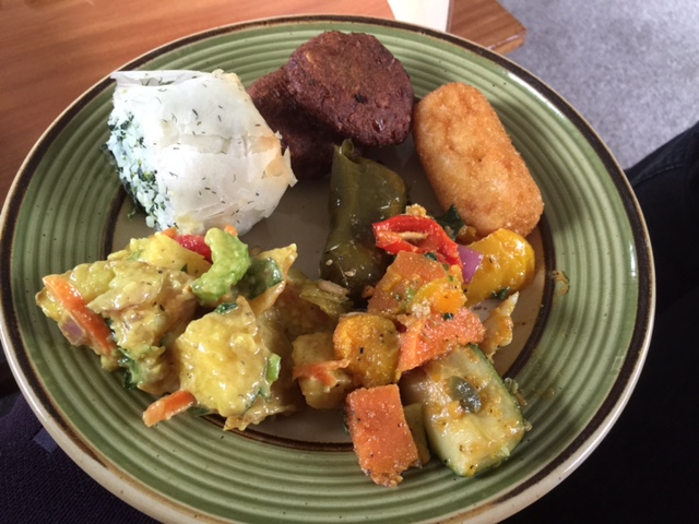 We just chose a selection of vegetarian items from the cabinet – falafel, potato croquettes, domades, spanakopita, potato salad and roast vegetable salad. These were priced anywhere from 3 for $5 for the likes of the croquettes and falafel to $7.50 for the salad pottles. Total was $42.50 and did 3 fairly large servings for lunch.