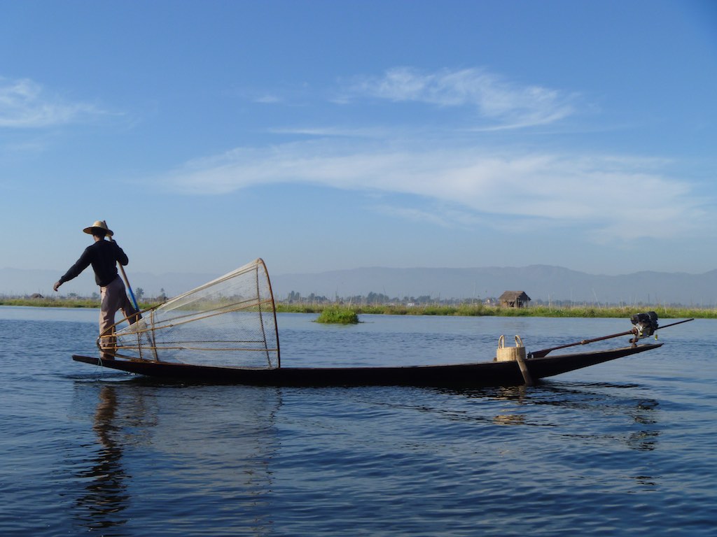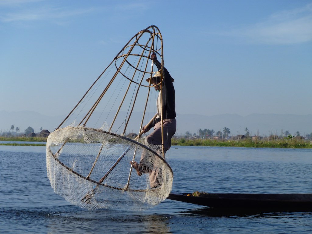 The fishermen of Inle Lake have a unique way of rowing. Essentially they stand on the very far end of their small boats, and wrap one leg around the oar and then use this to row. The lake is full of weeds and plants, which if they were sitting, they wouldn’t see and also allows them to see the bubbles created by the fish.