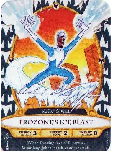 When the villain appears, you use a combination of any of your spell cards to try to defeat the villain. The system is clever enough to recognise the cards you are holding up and you see what the effect is on the screen. So for example, the Rapunzel card whips with her hair and Frozone attacks with ice.