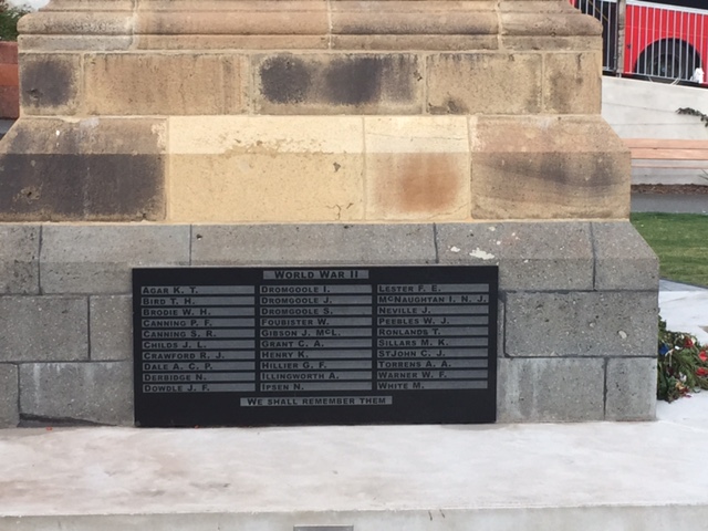 Finishing up for the day, we headed back through the main part of the town and spied the War Memorial.  Most of the names on either side were World War 1.  Hard to believe such a small town lost so many men. On the small plaque at the bottom it had the names from World War 2, and again Keith’s name is on this memorial.