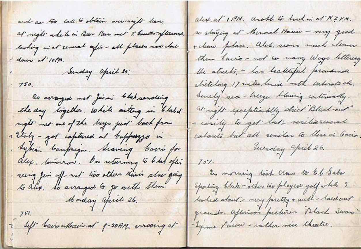 As arranged met Jim in Club, spending the day together.  While sitting in Club at night met one of the boys just back from Italy – got captured at Capuzzo in Syrian Campaign.  Leaving Cairo for Alex tomorrow.  On returning to Club after seeing Jim off, met two other Kiwis also going to Alex.  So arranged to go with them.