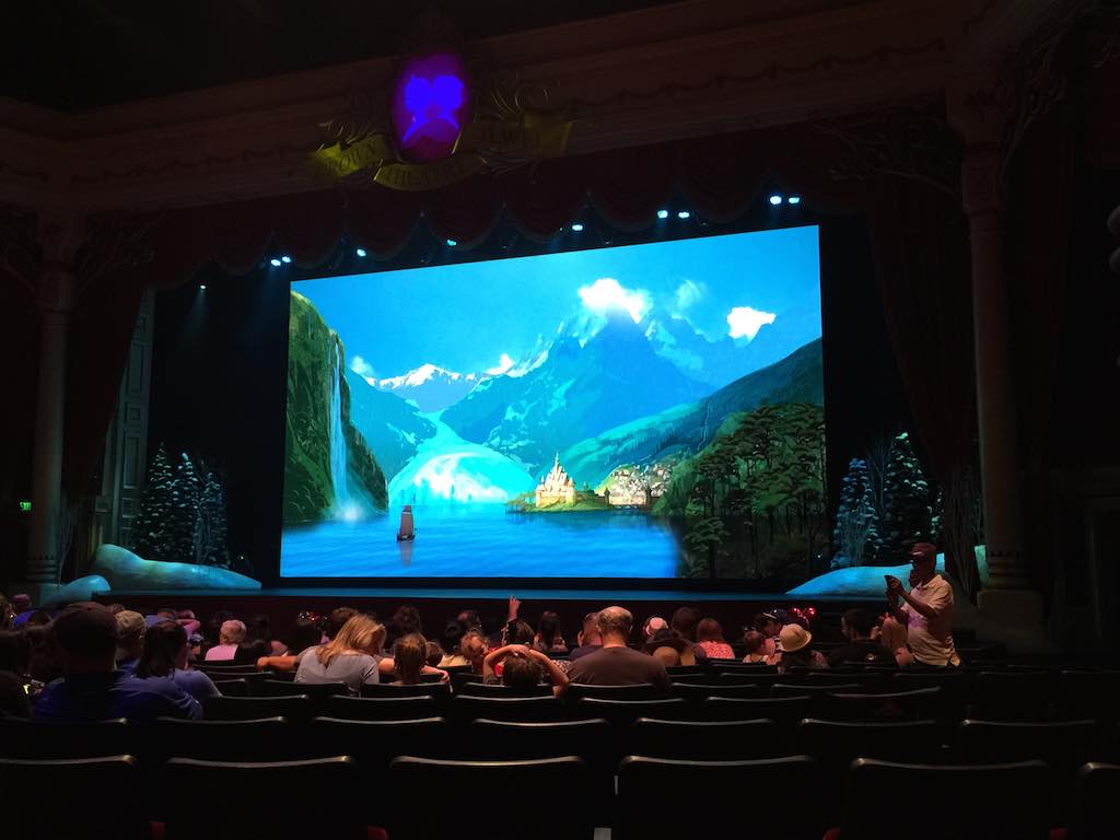 Before the show the had a picture of Arendelle on it, the water ripples and birds fly across the screen. As you can see, we sat towards the back of the theatre, as I didn’t like to scare small children with my warbling.