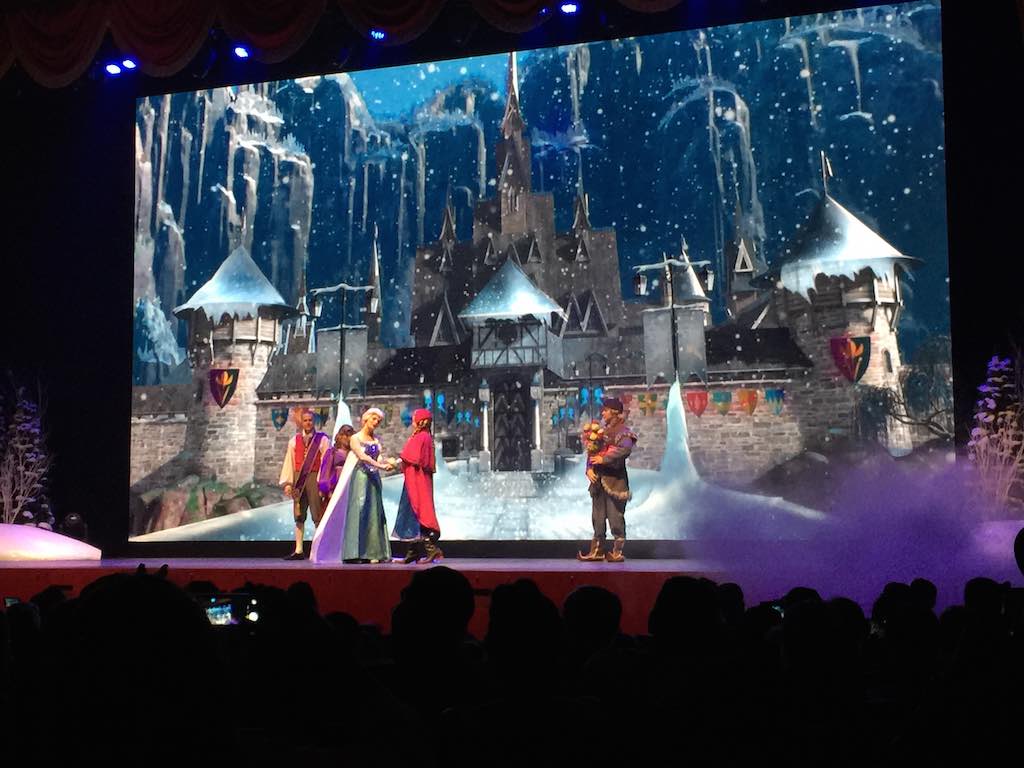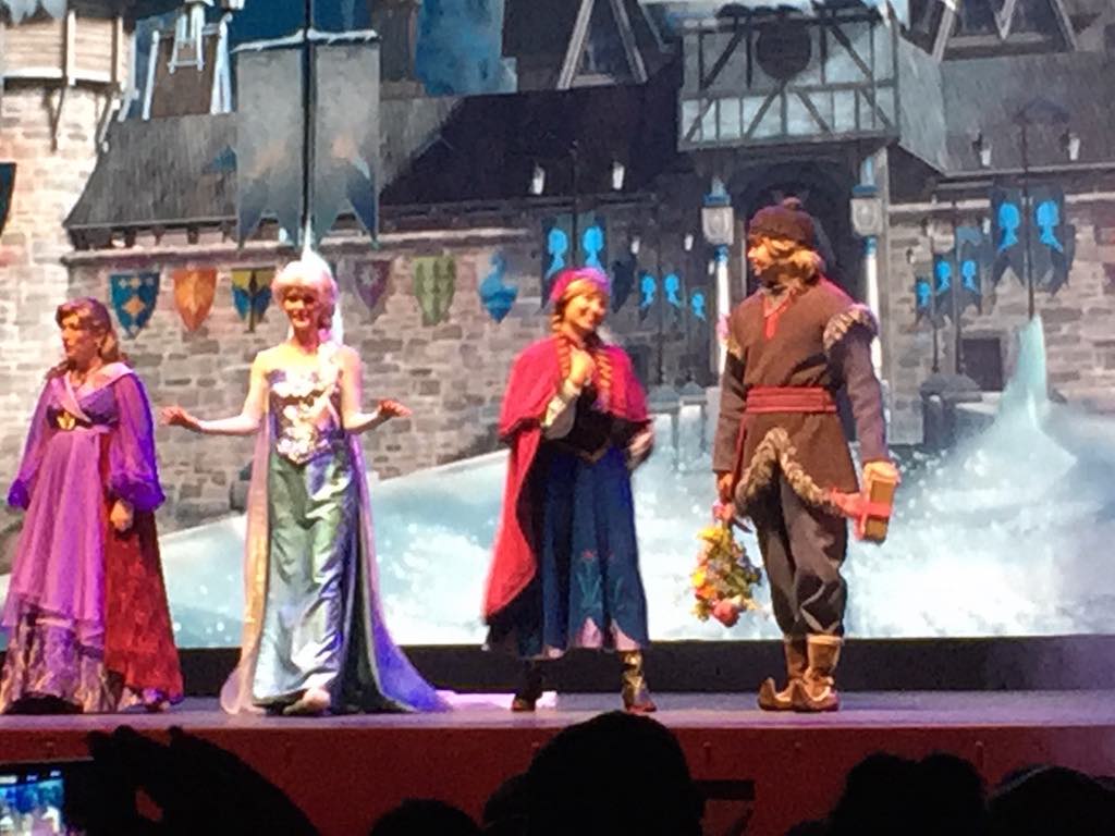 The show started and I was thrilled to see it was “live action” and not just a movie. There were two performers who were the Arendelle historians who were telling the abbreviated story from the movie. Essentially there to just link each song together. Anna, Elsa and Kristoff all appear on stage for the appropriate songs.