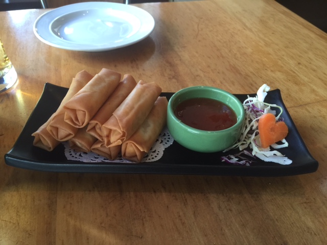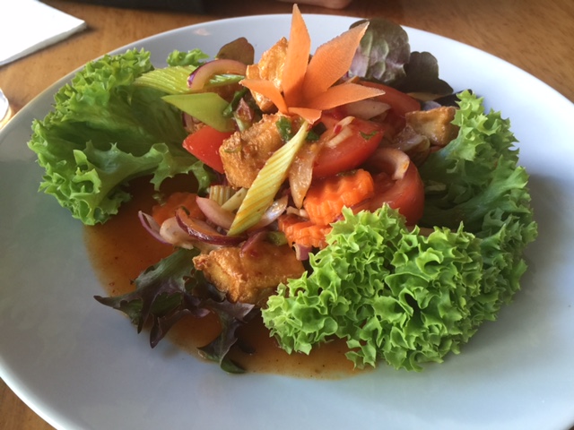 We ordered spring rolls to start followed by a spicy tofu salad with lemongrass and … stuff. It was delicious and spicy. We also had a vegetable and tofu satay with steamed rice (not pictured).