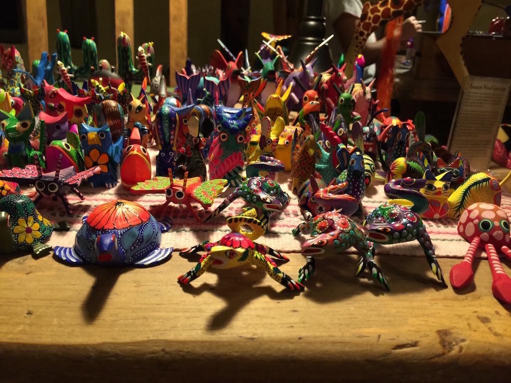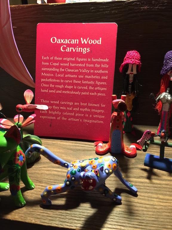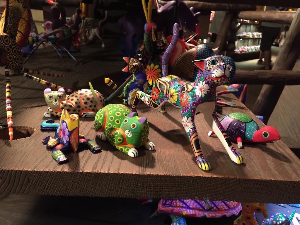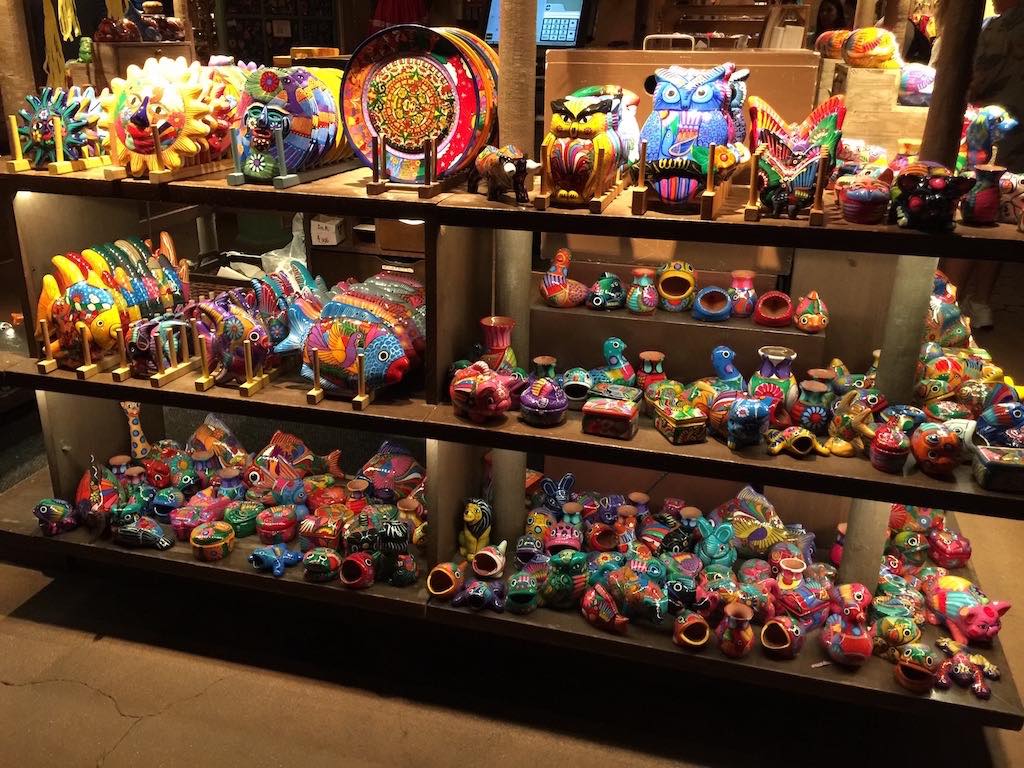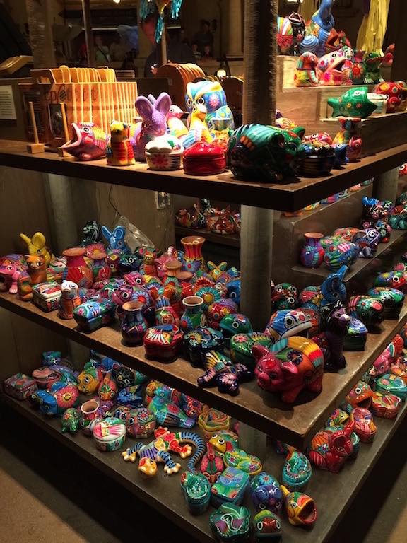 Inside the Mexico pavilion, its meant to represent a night-time market in a small town plaza. Here you will find a number of places to shop. Firstly within the “market” area itself in the main courtyard. This is where you will find Oaxacan Wood Carvings. These are actually being made by artisans so it would be possible to actually watch one of these being painted (the final step) and then buy the finished item.