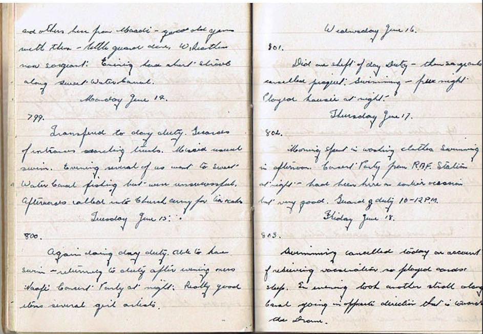 Transferred to day duty. Guards of entrances, searching trucks. Missed usual swim. Evening several of us went to Sweet Water Canal fishing but were unsuccessful. Afterwards called into Church Army for tea & cake.