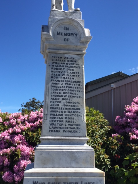 The original memorial was unveiled in 1924 and then following WW2, the additional names were added for the men who died serving from Glenorchy during that war. By the time World War 2 arrived, the population in the town was back to its normal numbers, so the loss of life was 5 men instead of the staggering 25 from WW1.