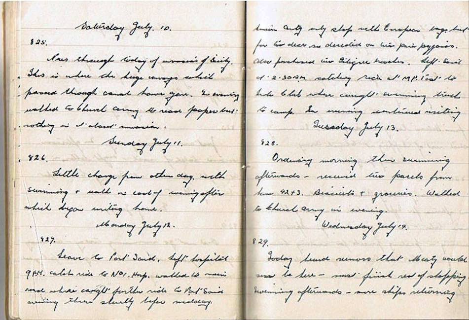 Leave to Port Said. Left hospital 9am – catch ride to #1 Hosp. Walked to main road where caught further ride to Port Said arriving there shortly before midday. ??? ??? only shop with European bags but far too dear so decided on two pair pajamas. Also purchased two Filigree Brooches. Left Said at 2.30pm catching ride at MP Post to Indian Club where caught ??? truck to camp. In evening continued writing.