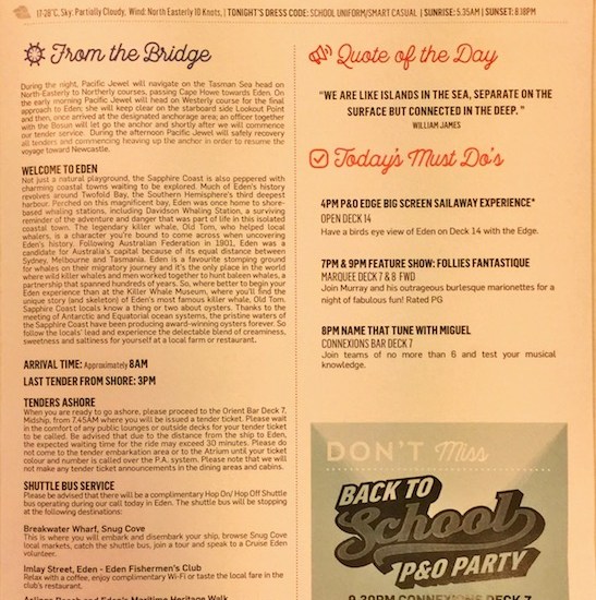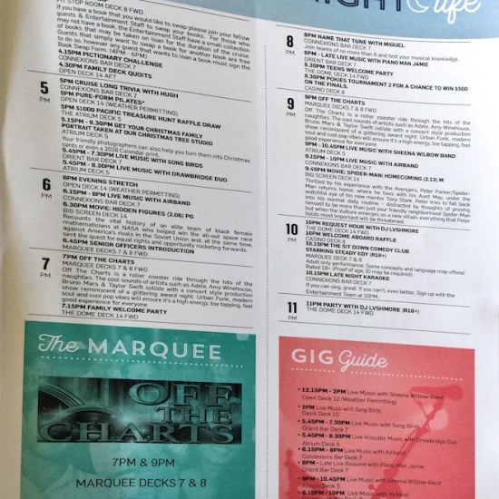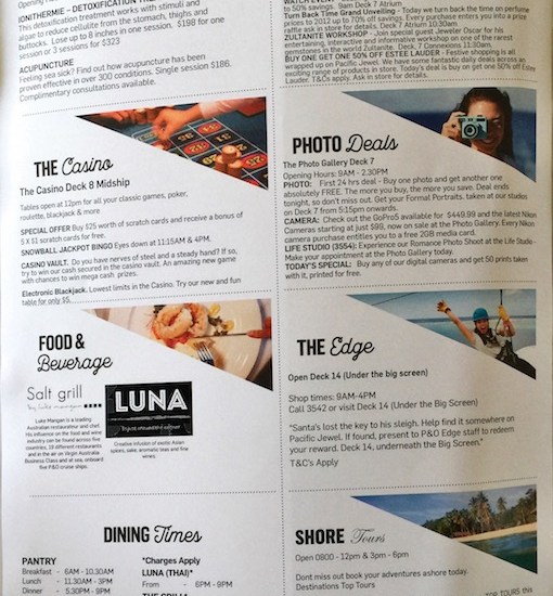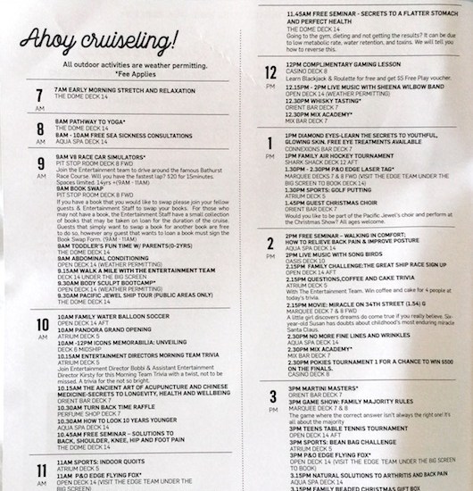 Prior to my P&O cruise I was unable to find many examples of the onboard activities. This post contains the P&O Goodtimes which is the daily schedule of activities available on the Pacific Jewel on the 11 day sailing from Melbourne to Gladstone and back to Melbourne again.